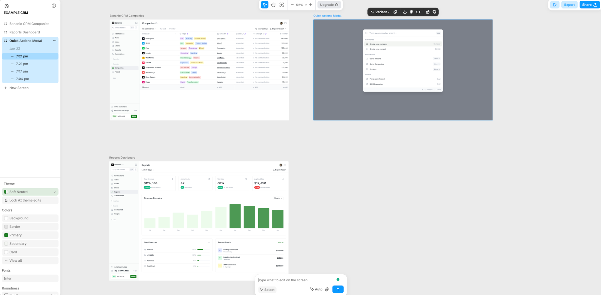 - Generate multiple screens simultaneously: Create login flows, dashboards and profile pages with the same prompt